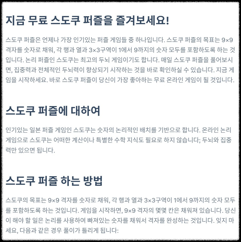 난이도에 따라 다르지만 보통 10분에서 30분 정도 소요됩니다. - 스도쿠를 통해 얻는 효과는 무엇인가요?