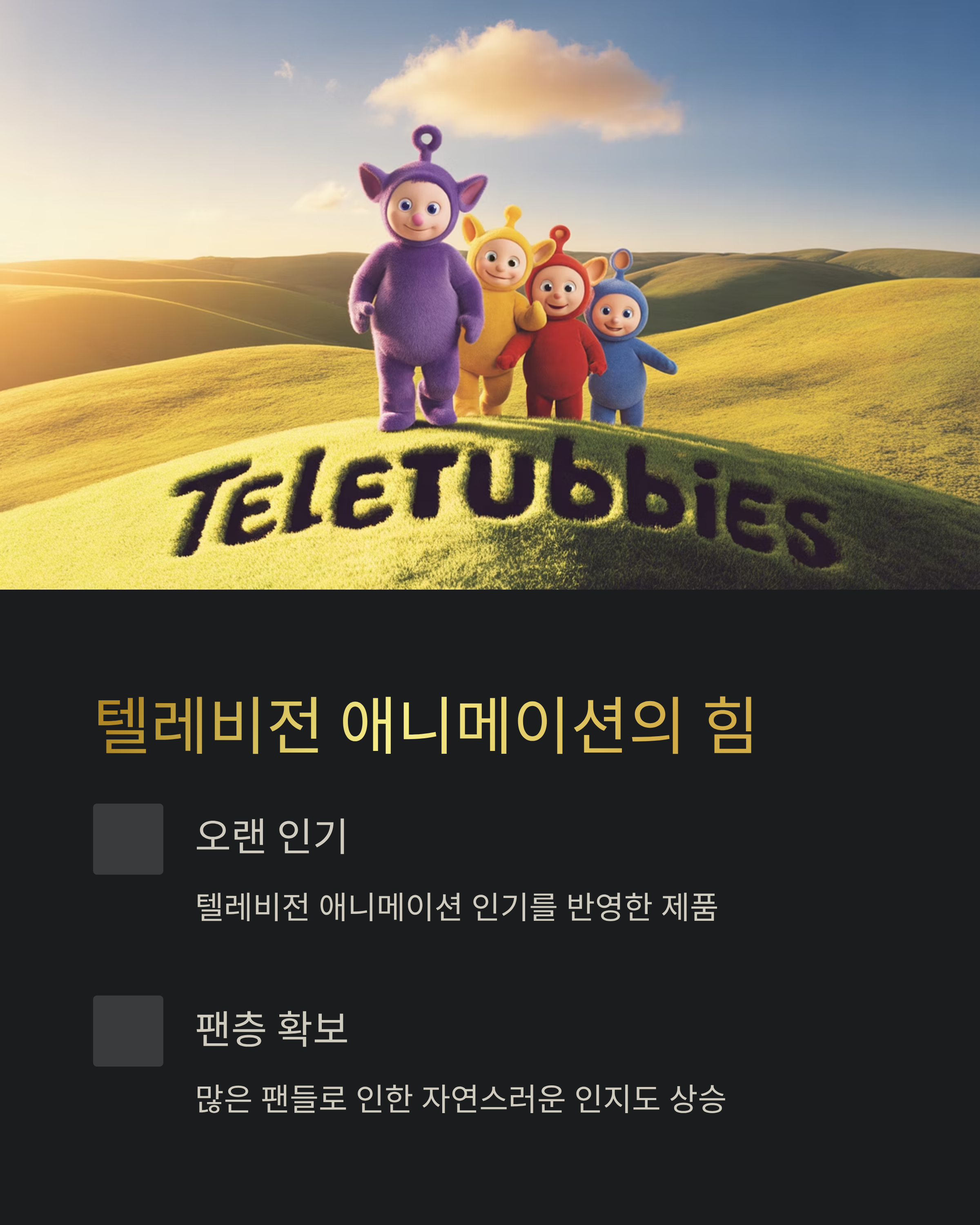 | 브랜드 인지도 | 텔레토비는 오랜 시간 사랑받아온 캐릭터이기 때문에, 브랜드에 대한 신뢰도가 높습니다. |
