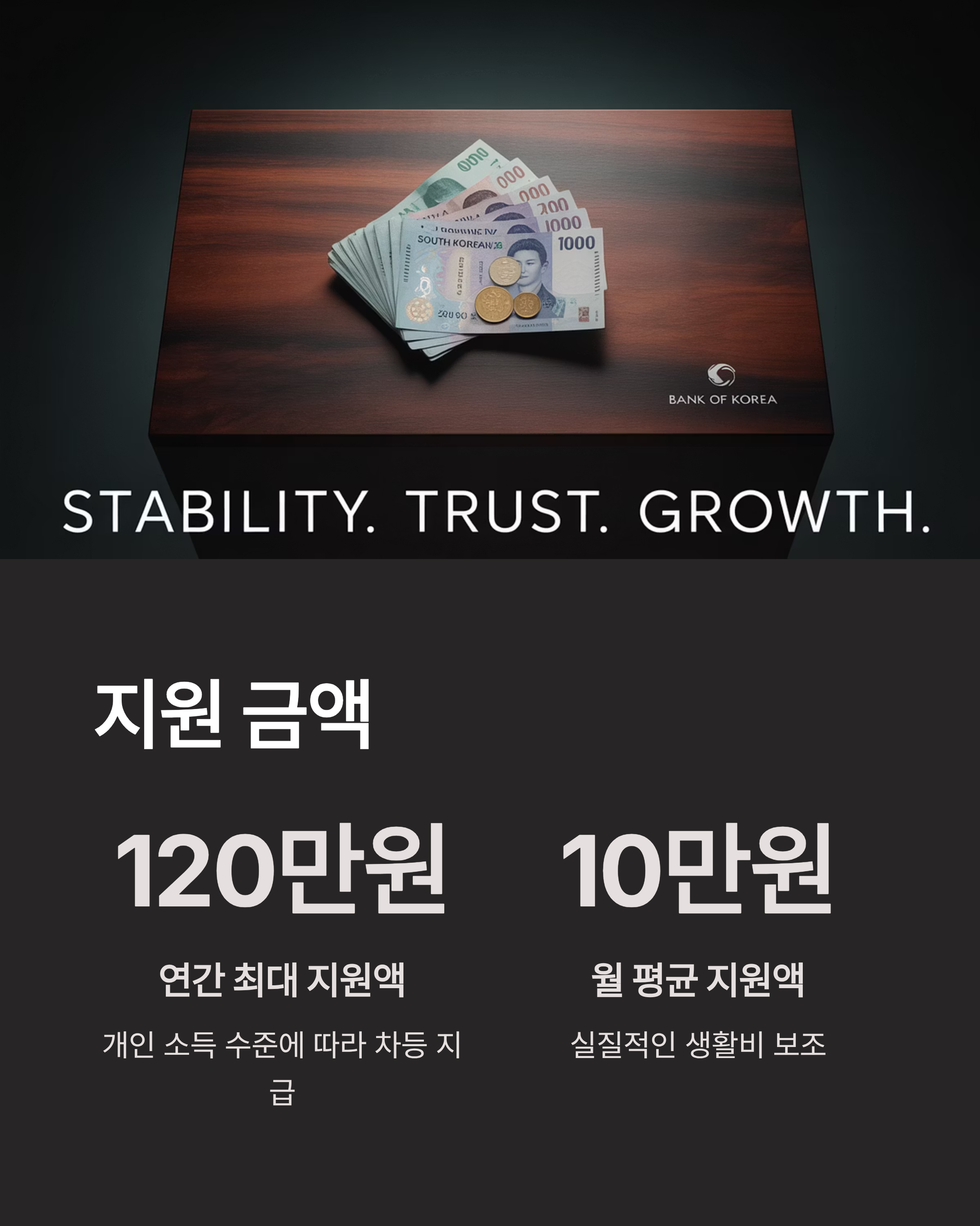 장년수당의 지원 금액은 연간 최대 120만 원입니다. 이는 월 약 10만 원 정도의 지원을 의미합니다. 하지만, 지급 금액은 개인의 소득 수준에 따라 다를 수 있으므로, 실제 지원 금액은 차등 지급됩니다.