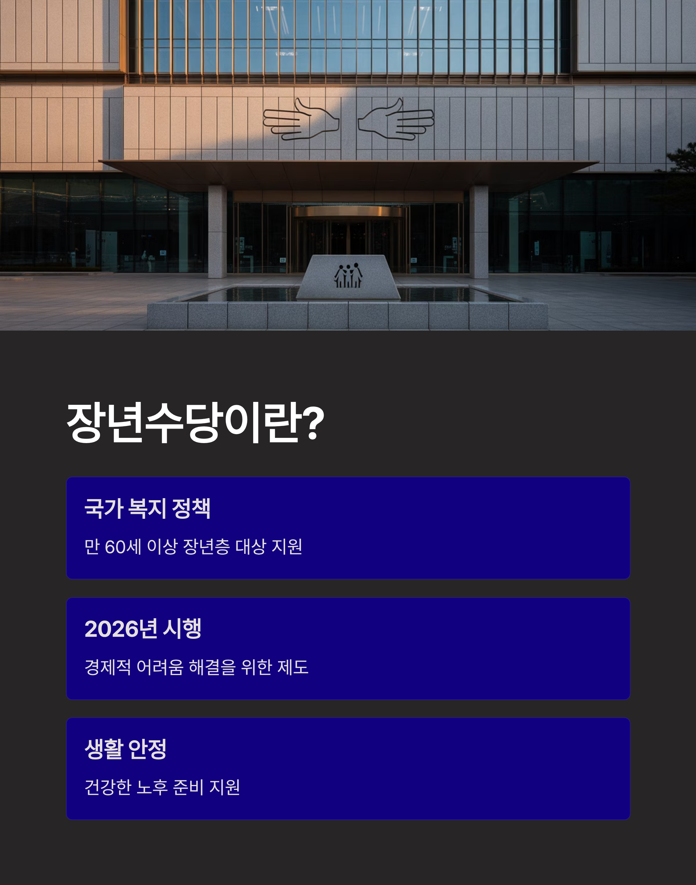 장년수당은 만 60세 이상의 장년층을 대상으로 하는 국가의 복지 정책입니다. 이 정책은 경제적으로 어려운 노인을 지원하여 생활 안정과 건강한 노후를 보장하기 위한 제도입니다. 2026년부터 시행될 예정이며, 많은 분들에게 실질적인 도움을 줄 것으로 기대됩니다.